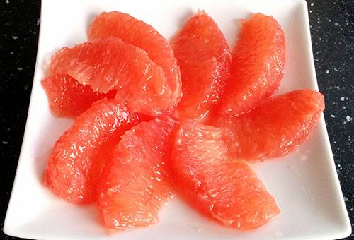 - Дольки грейпфрута вырезаются ножом. При этом мембранные перегородки отделяются. Они имеют горький привкус, и поэтому их не используют.