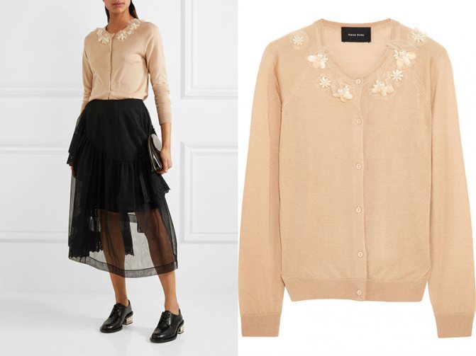 Совет стилистаПоскольку в тренде полностью бежевые луки — поддержите такой кардиган леопардовым принтом в аксессуарах или тёмно-, насыщенно-коричневыми деталями образа, чтобы бежевый жакет был не пассивным фоном, а гранью переливающегося перламутра.