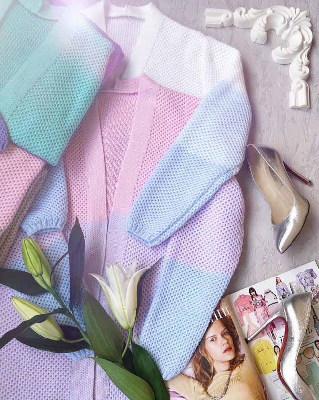 Сегодня в моде насыщенные цвета. В одной вещи могут сочетаться несколько разных оттенков. Плавные переходы от одного цвета к другому – прием, который мы часто будем встречать ближайшей осенью. Градиент эффектно смотрится на фактурной вязке: косичках, сотах, резинке.