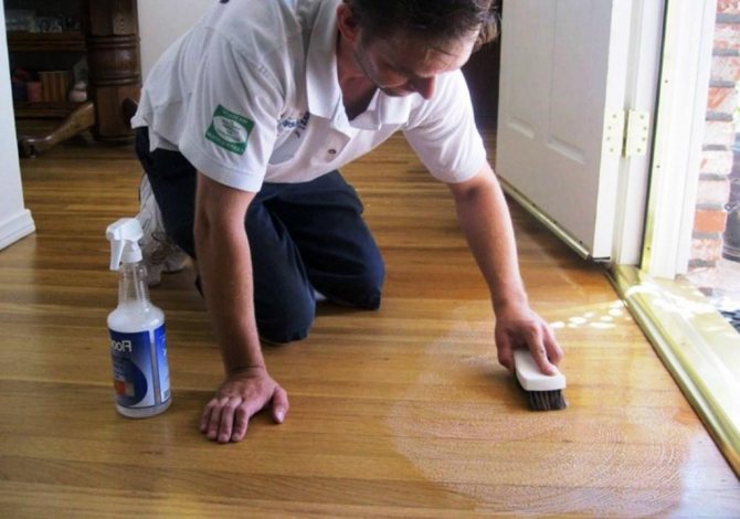 Для этого протрите маленький участок пола, чтобы понимать безобидность данного вещества. Принцип удаления тот же, что и с растворителем.