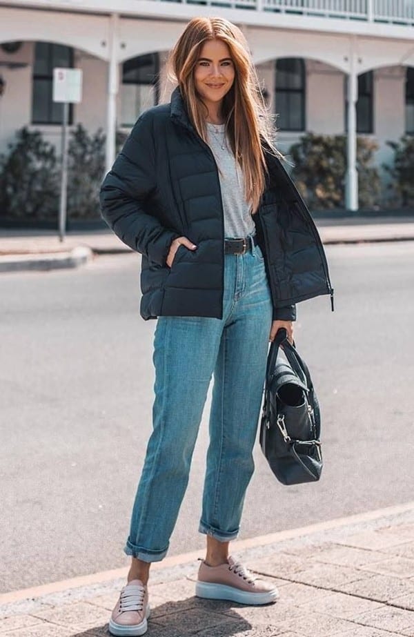Зимой бойфренды также позволят составить привлекательный лук, ведь они отлично сочетаются с пальто, паркой, укороченным пуховиком.