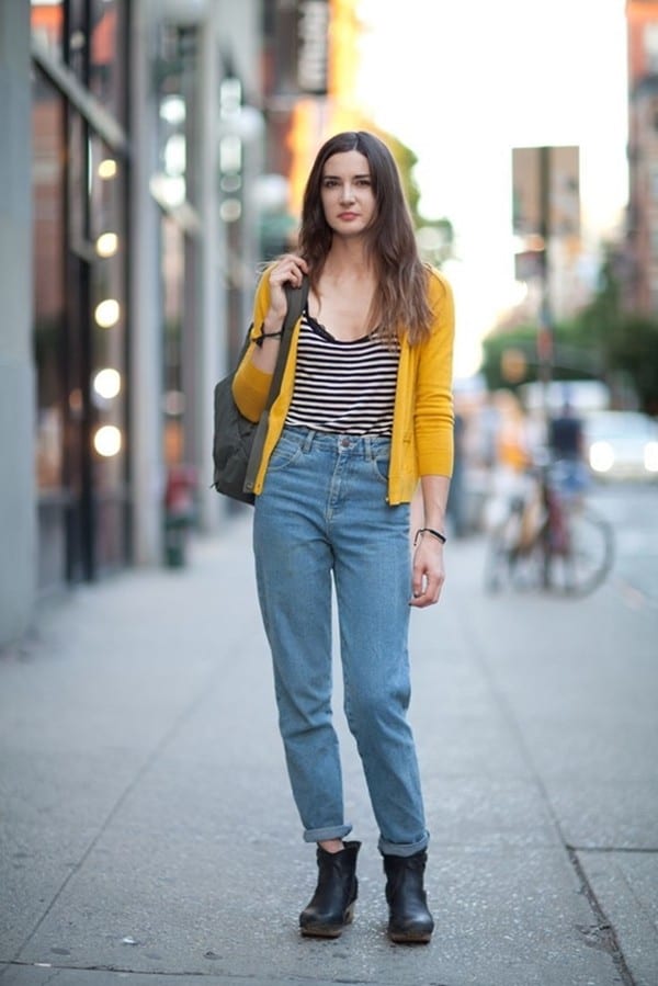 Также интересно будет выглядеть сочетание заправленной легкой блузки, джинсов мом и кардигана без рукавов. Такой аутфит прекрасно подойдет даже для похода на работу.