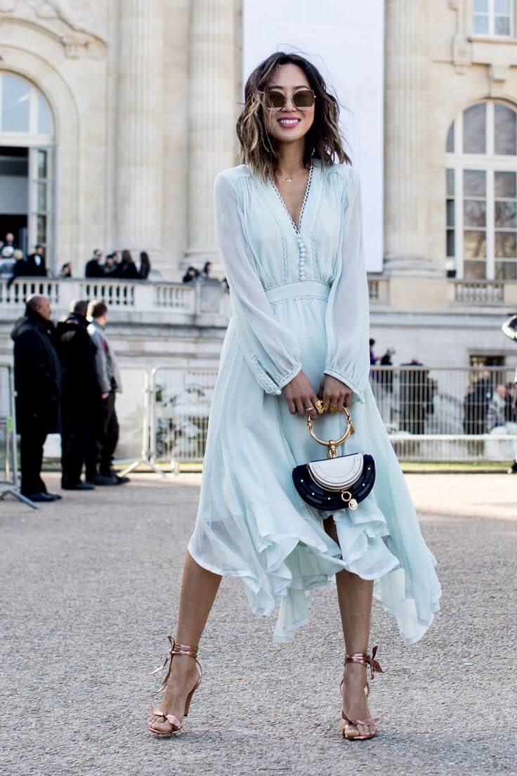 Это свободный наряд в области живота и бедер. Используемая ткань является самодостаточной и не требует украшений. Такой лук подойдет практически каждой, светлые тона визуально молодят.