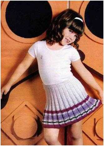 Трендом модного сезона можно по праву считать плиссерованную юбку. Чтобы она не выглядела слишком строго, следует разнообразить ее нижнюю часть цветными полосками. Такой фасон изделия можно связать полностью резинкой, например полой или двойной.