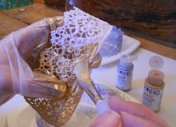 - Готовое изделие покрывают золотистой акриловой краской и украшают тесьмой и бижутерией.