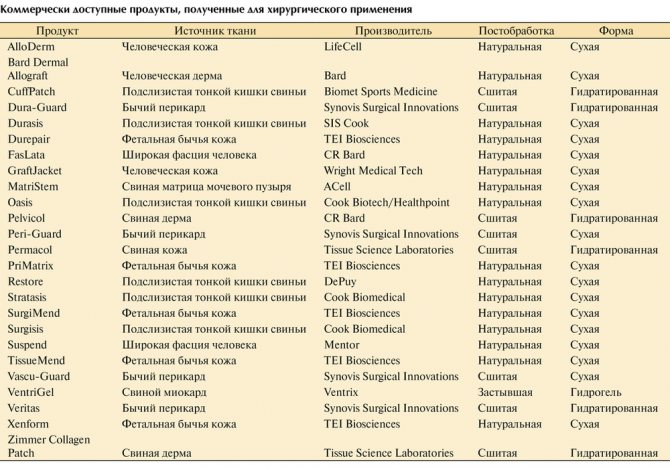 Коммерчески доступные продукты, полученные для хирургического применения представлены коммерчески доступные продукты, полученные для хирургического применения.