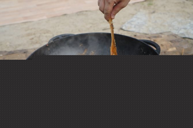 - Казан наклоняют в разные стороны. При этом стараются не разлить масло на огонь. Внутреннюю поверхность можно смазать с помощью шумовки.