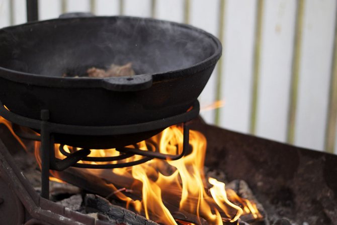 При обработке на костре достигают высоких температур, нагревая всю поверхность казана как внутри, так и снаружи. Огонь должен быть открытым, жаровню и другие конструкции при этом не применяют.