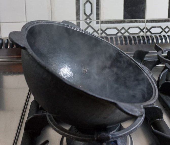 - Котел прокаливают 3-5 часов. За это время на внутренней поверхности казана образуется твердая масляная пленка, благодаря которой пища не будет пригорать. После этого посуда готова к использованию.