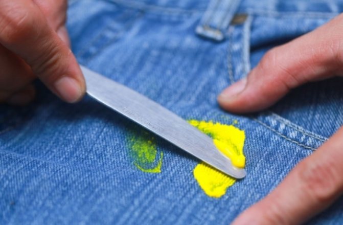 Сначала нужно тупым ножом или металлической щеткой снять с джинсов засохший слой краски. Если ткань относительно тонкая, лучше воспользоваться деревянной лопаткой.
