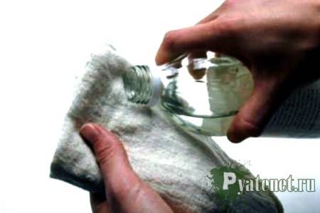 Применяется для уничтожения пятен на темных вещах. Загрязненный участок заливается спиртом либо водкой. Обычно результат виден практически сразу. Максимальное время, которое можно держать водку на ткани до часа. Дальнейшая стирка удалит остатки грязи и запаха.