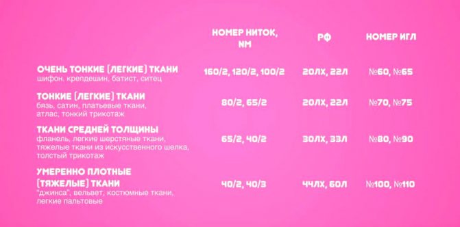 Сводная таблица соответствия толщины тканей толщине нитей и игл