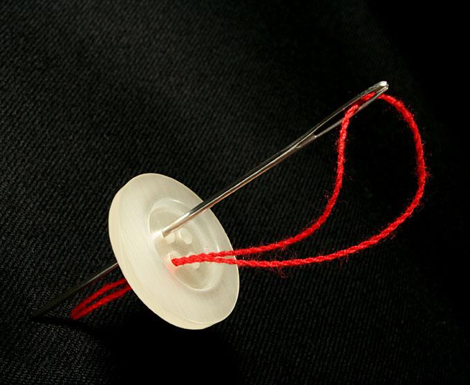 - С «лица» на вышедшую из ткани иголку надеть пуговицу через любое отверстие;