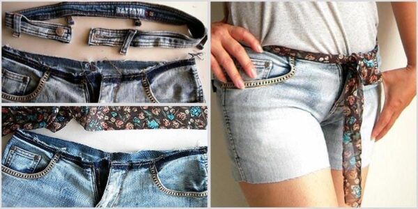 Бывают случаи, когда джинсы хорошо тянутся в бедрах, но тугой пояс не позволяет застегнуть их. Тогда эту деталь одежды можно полностью убрать. Роль пояса и застежки может выполнять широкая лента, тонкая шаль или другая ткань, которую следует прикрепить к основной части по кругу.
