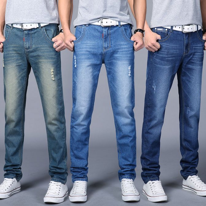 Зимние брюки изготовлены из плотной ткани темного цвета: коричневого, серого, черного, синего. Летние джинсы шьют из тонкой легкой ткани светлых тонов. Качество материала брюк можно определить по его фактуре. Ткань хорошего качества не заламывается, не мнется, шероховатая на ощупь. Настоящая джинсовая ткань тяжелая, поэтому изделия из нее должны иметь существенный вес. Она изготавливается из натурального хлопка. Некоторые производители добавляют немного эластина для того, чтобы готовые изделия из нее сохраняли форму, обладали хорошей износоустойчивостью. Именно такая джинсовая ткань идет на зауженные мужские джинсы.