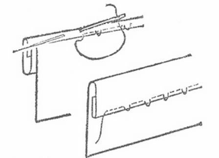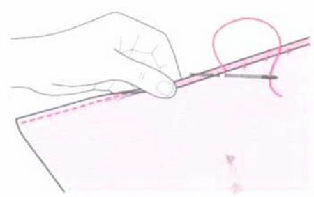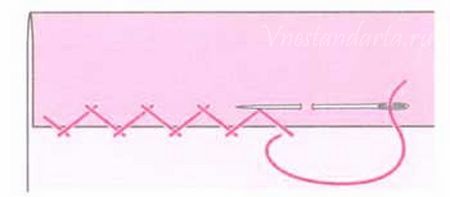 Схема такова – вводим иглу с ниткой ниже края сгиба, делая стежок в обратном направлении, затем выводим нитку вперёд и вводим мглу выше края сгиба в том же направлении. Идём слева направо по всей длине изделия, соединяя таким образом сгиб с тканью.