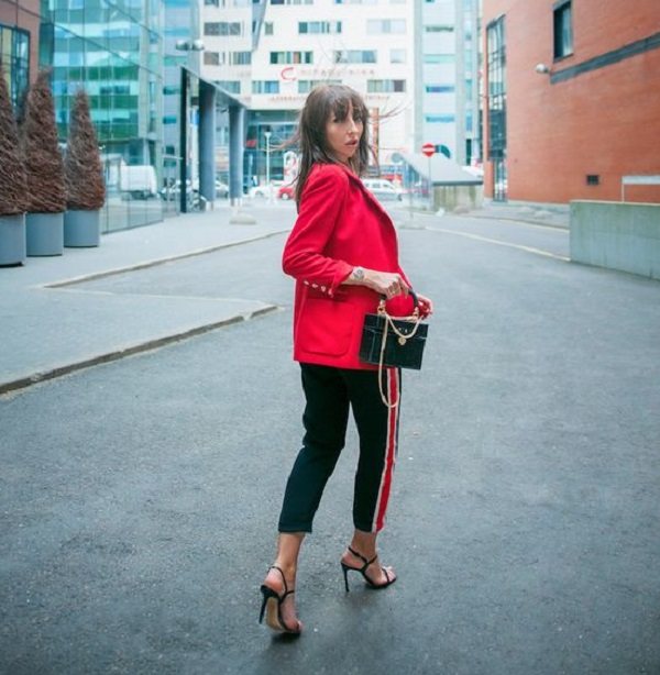 Чтобы внести изюминку в будничный лук, не бойтесь использовать яркие и сочные краски. Очень круто выглядит комбинация из черных штанов с лампасами с красным пиджаком. Изящные босоножки идеально дополнят этот лук и придадут ему стильное настроение спорт-шика.