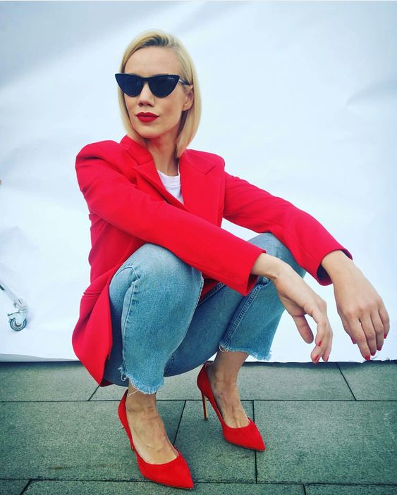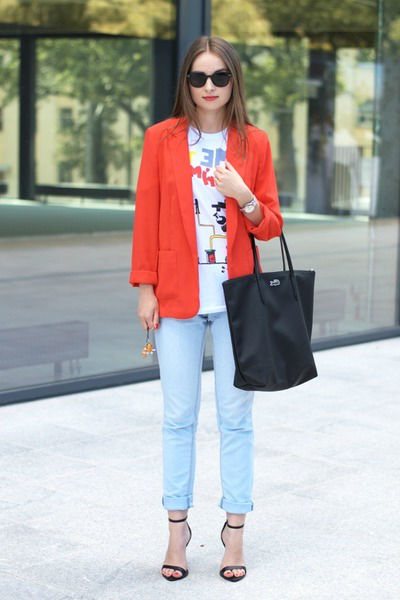 Несмотря на свою яркость и строгость, красный жакет прекрасно чувствует себя в будничных образах. Например, вы можете составить стильный тандем с голубыми джинсами и принтованной футболкой. Модные тенденции допускают в таком луке обувь в различном стиле: прекрасно подойдут как лодочки или босоножки, так и кроссовки или слипоны.