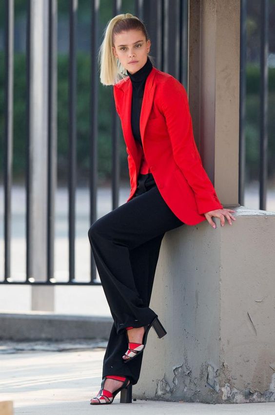 Красный пиджак – это выбор уверенных в себе модниц. А его сочетание с черной водолазкой и такими же брюками клеш – просто загляденье! Если вы хотите выглядеть безупречно, быть центром внимания и собирать комплименты, такой образ поможет вам достичь этой цели на 100%!