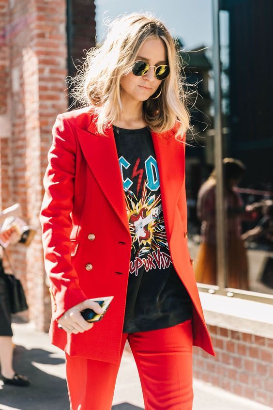Эти фото подскажут вам, как носить модный красный пиджак на работу. Строгая рубашка и классические черные брюки немного снизят яркость верха и настроят образ на более серьезный лад.