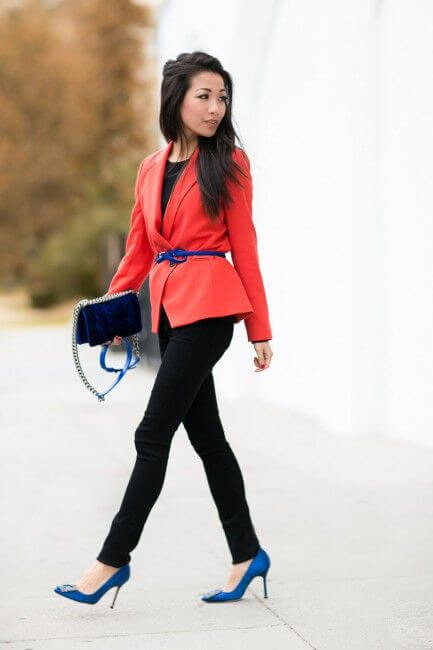 Завершенность любого сочетания всегда создают детали. В продуманности лука на фото сомневаться не приходится – изящный ремешок и клатч идеально вписываются в образ с красным пиджаком. База здесь грамотно выбрана в классическом черном цвете, чтобы не конкурировать с яркостью остальных вещей.