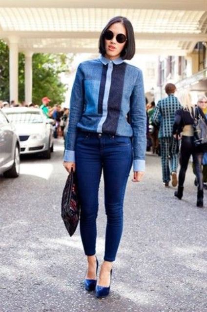 Туфли синего цвета, на высоком каблуке под джинсы синего оттенка, облегающего кроя составят гармоничный ансамбль со свитером с принтом в голубых тонах и объемным клатчем.