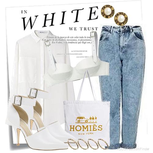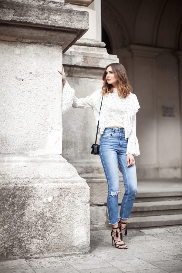 Туфли белого цвета, с узким носом и застежками, на высоком каблуке под джинсы серо-голубого оттенка, прямой модели будут отлично выглядеть с рубашкой белого тона, с длинными рукавами.