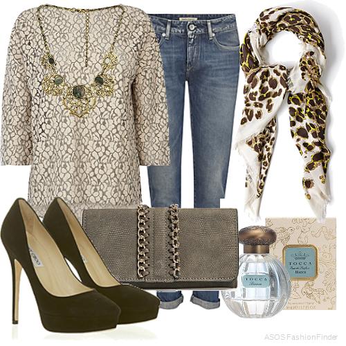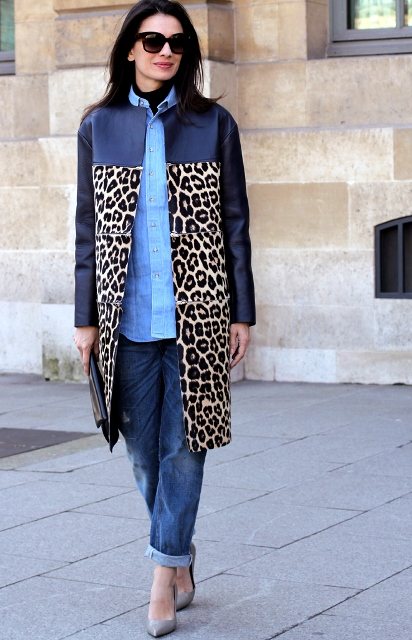 Туфли серого цвета, на высоком каблуке под джинсы синего оттенка, свободной модели дополняют рубашку голубого тона, плащ с анималистическим принтом и кожаными вставками, длиной до колен и клатч черной расцветки.