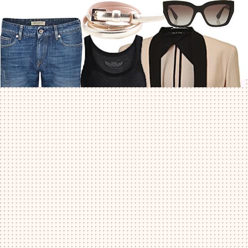 Туфли черного цвета с узким носом, на высоком каблуке под джинсы синего оттенка, прямого фасона составят гармоничный ансамбль с майкой на лямках черного тона, пиджаком и клатчем бежевой расцветки.