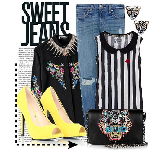 Туфли желтого цвета с открытым носом, на высоком каблуке под джинсы голубого оттенка, прямого силуэта сочетаются с блузкой с полосатым принтом, без рукавов, жакетом с вышивкой и меленькой сумкой черного тона с рисунком.