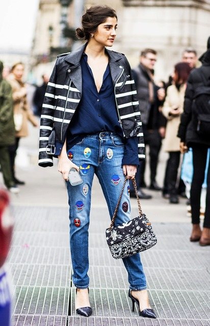 Туфли черного цвета с узким носом, на высоком каблуке под джинсы голубого оттенка с аппликацией, облегающего фасона хорошо смотрятся с рубашкой темно-синего тона, кожаной курткой черной расцветки с белыми вставками и небольшой сумкой.