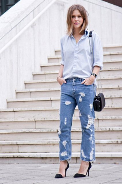 Туфли черного цвета, на высоком каблуке под джинсы голубого оттенка, свободной модели создадут стильный образ с рубашкой светло-голубого тона и маленькой сумкой черной расцветки.