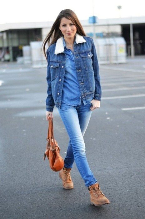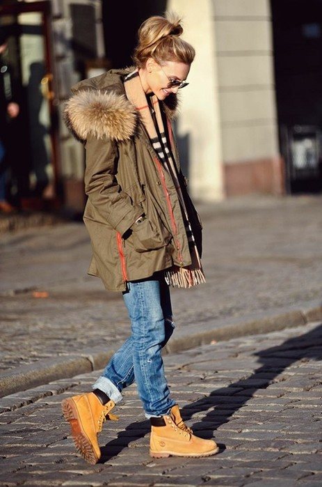 Один из самых популярных элементов гардероба каждой женщины, олицетворение повседневного образа и удобства. С ними хорошо сочетаются тимберленды — ботинки со шнуровкой, из нубука либо мягкой кожи горчичного цвета на массивной рифленой подошве.