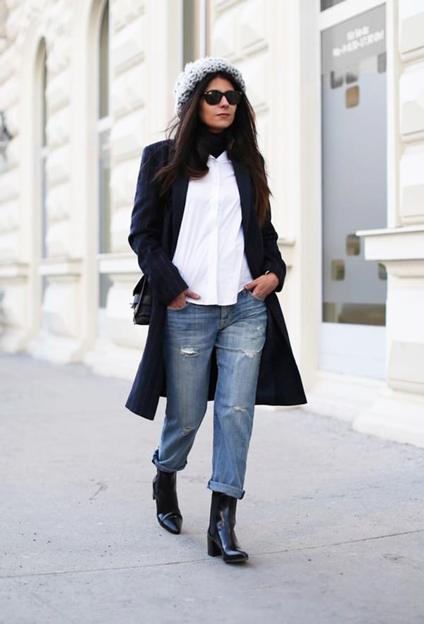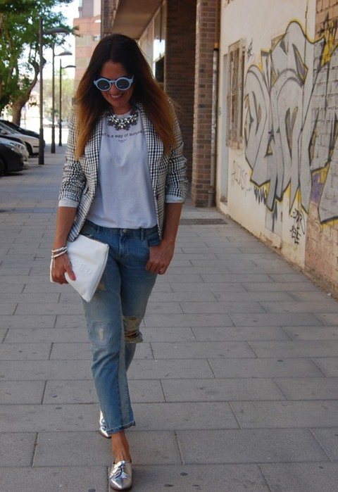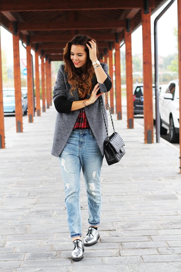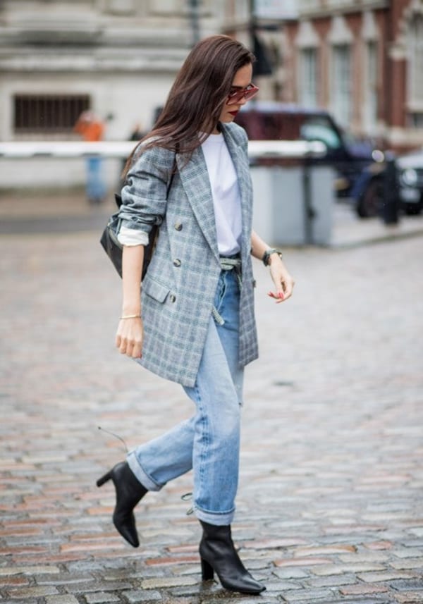 Стиль и само название бойфрендов отсылает к мужскому характеру изделия. Это будет поводом игры на контрастах в образах. Модницы любят комбинировать свободные бойфренды с подчеркнуто женственной обувью. Это могут быть трендовые ботильоны-носки. В такой образ следует подобрать аксессуары в тон низа.
