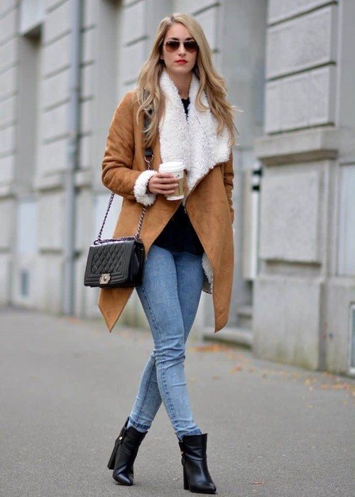 Клеш. Если классические джинсы можно носить с любой обувью, то для модных клешеных брюк лучше выбрать обувь на каблуке. Очень красиво смотрятся образы с джинсами клеш и заправленной рубашкой. В качестве верхней одежды здесь подойдут короткие кожаные куртки, пальто средней длины, легкий кардиган и полушубок.