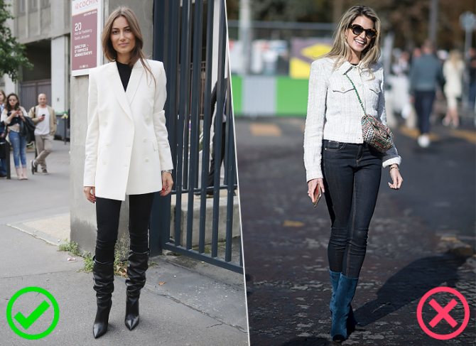 Сапоги-чулки находятся на границе дозволенного. Если вам так подсказывает ваш стиль – не отказывайте себе, однако рекомендуется предпочитать им широкие сапоги с присборенным «гармошкой» голенищем.