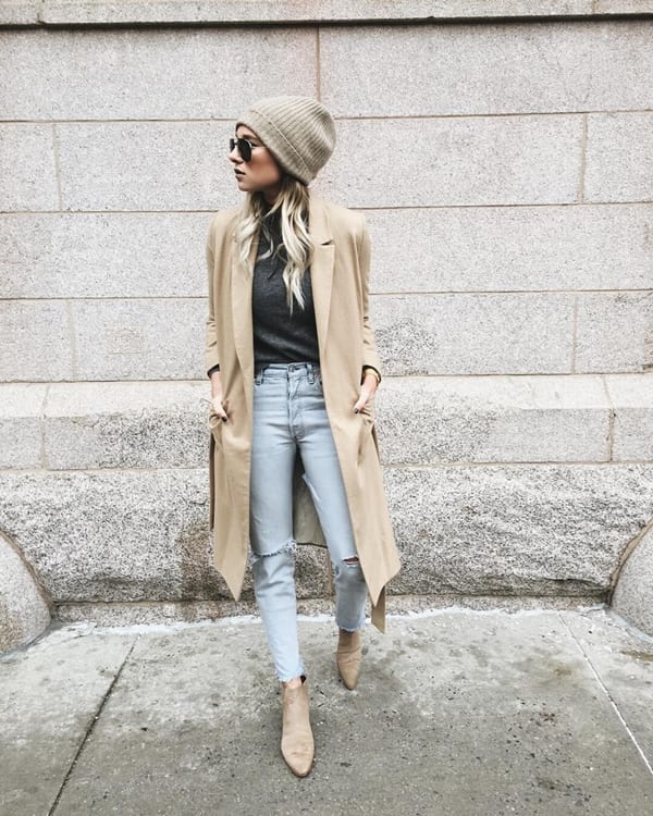 Выбрав для осенне-зимнего образа белые джинсы, вы можете подобрать любую верхнюю одежду. Очень нежно будет смотреться с белыми джинсами пальто пастельных оттенков. Стильным получится и тандем серого пальто, а также не забываем о контрастном сочетании черного с белым.