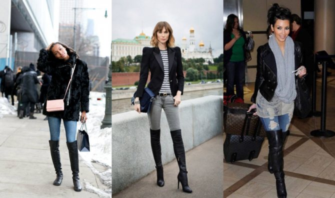 Сапоги и джинсы – это достаточно сложное сочетание. Высоким девушкам рекомендуется выбирать высокие сапоги, а миниатюрные модницы могут остановить выбор на средней длине. Ботфорты и сапоги до колена выигрышно смотрятся со скинни. Классические прямые джинсы уместно надевать с облегающими сапогами средней длины. Отличный союз получится с сапогами в ковбойском стиле. Если джинсы широкие, их можно носить поверх обуви.