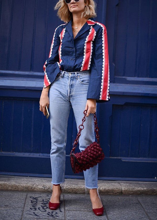 - Темный деним раскроется в ансамбле с яркой и оригинальной обувью. Приглушенный низ можно считать идеальной базой для различных экспериментов со стилем.