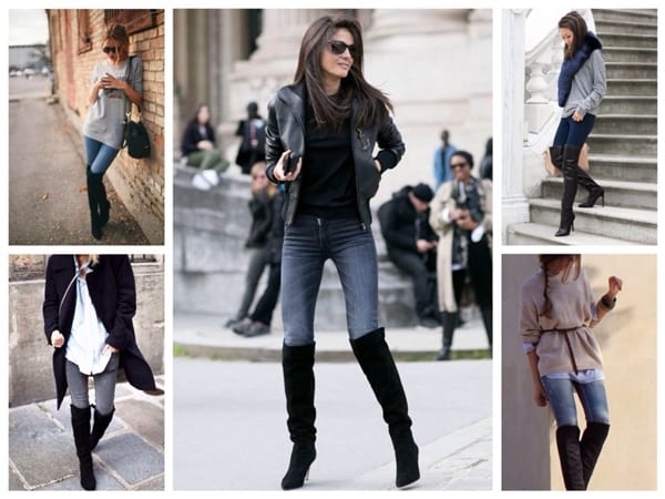 Сапоги до колена идеально подходят для скинни, заправленных внутрь. Зимой можно надеть замшевые сапожки на невысоком каблуке, предварительно выбрав джинсы из плотной ткани, предназначенные для морозного сезона. Осенью смело надевайте яркие резиновые сапоги, дополнив образ стильным шарфом в той же цветовой гамме, что и обувь.