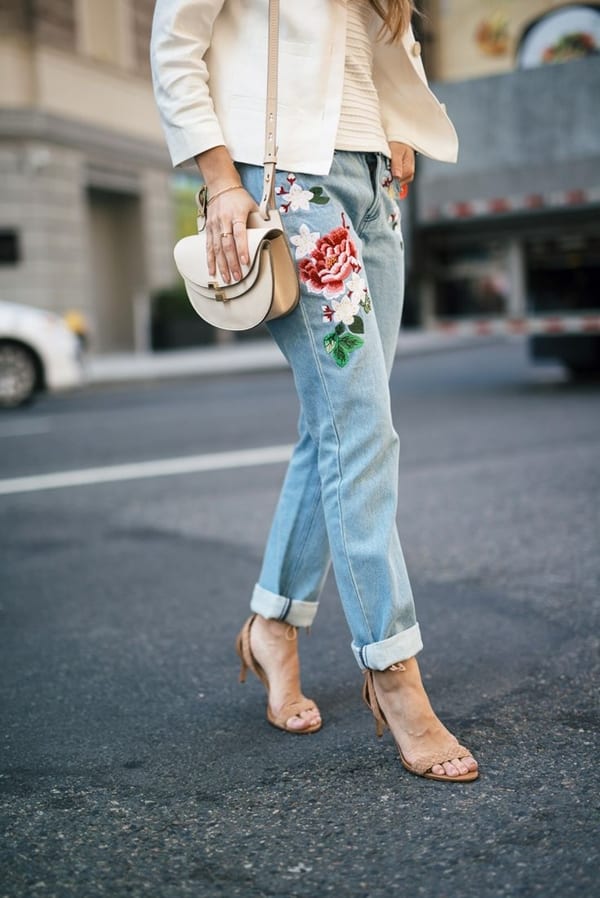 Декорированные. Очень интересны и притягательны модные джинсы осень-зима 2019-2020 декорированные яркой вышивкой, модели с бахромой и джинсы в стиле печворк. Чтобы образ не казался перенасыщенным, такие джинсы носят в однотонным верхом простого кроя.