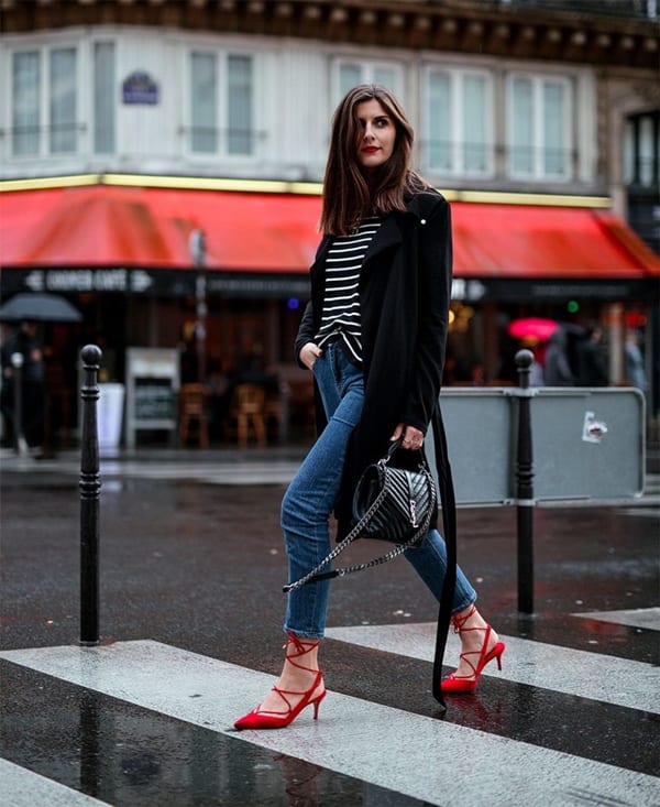 Сочетание обтягивающих джинсов с туфлями на шпильке – это безвкусица. Такая модель выигрышно смотрится с лодочками и дополнительно удлиняет и стройнит ноги.
