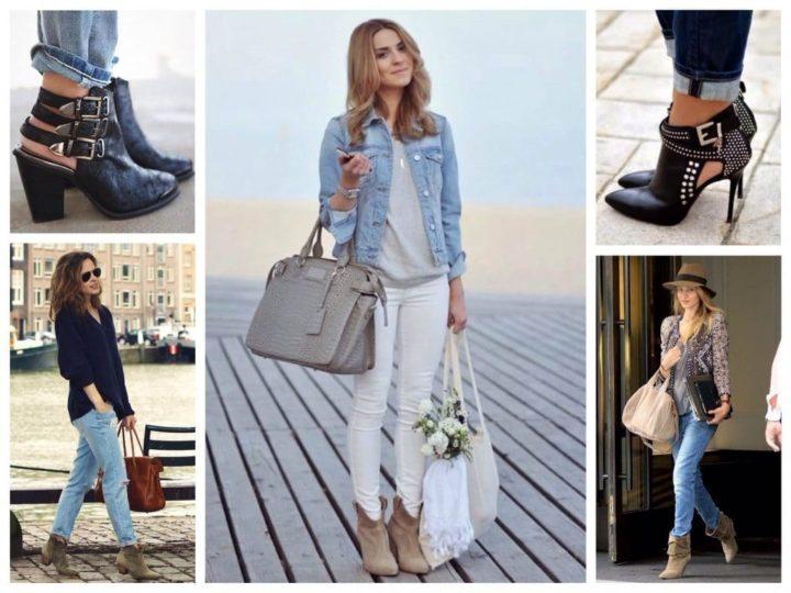 Сочетать джинсы и ботильоны стоит таким образом, чтобы обувь было полностью открыта. Иногда можно заправить или подвернуть брюк для создания нужного эффекта.