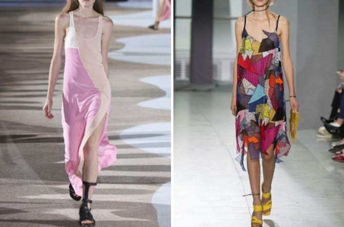 В этом году дизайнеры делают акцент на воздушности и женственности, предлагая легкие фасоны из струящихся тканей. Легкие материалы и простой крой позволяют носить модели в жаркую погоду в повседневной жизни. Более сложные и интересные модели с драпировкой, многослойностью и различными деталями предлагаются для особых случаев, вечеринок и торжеств. [flat_ab id=»2″]