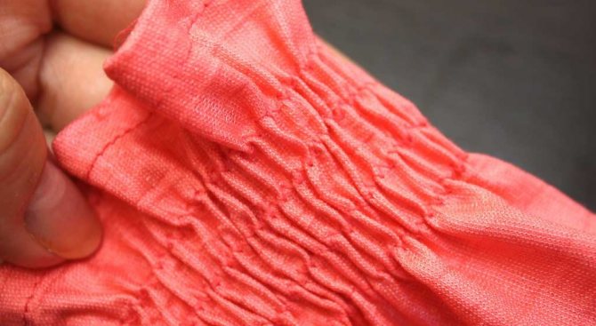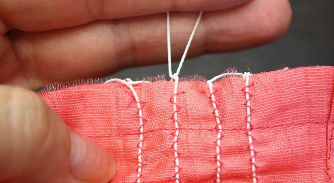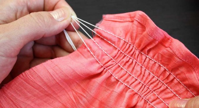 Закончив с первой строчкой, аналогично прокладываем ещё две-три. Пристрочив все резинки, удерживайте один их край (сразу всех!), а с другого края аккуратно потяните, стягивая их до необходимой длины.