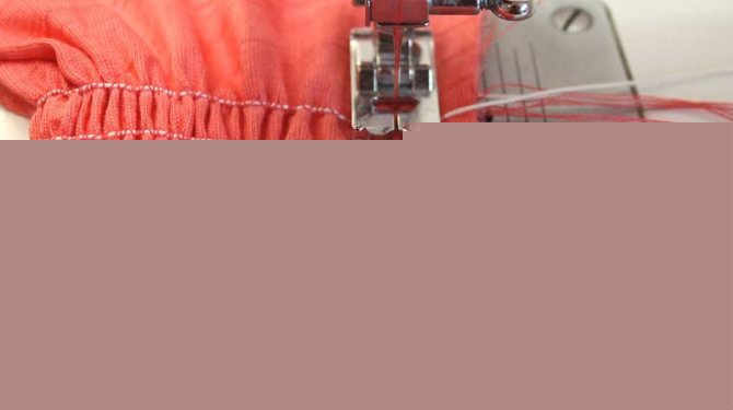 Устанавливаем на машинке ширину стежка 3 мм и длину 2-2,5 мм. Прокладываем чётко по центру эластичную нитку под лапку, пристрачиваем её швом «зигзаг». Следите за тем, чтобы игла не проколола резинку!