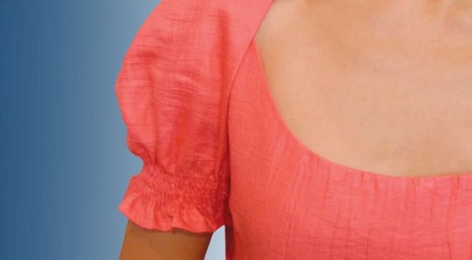 В процессе пошива изделия, будь то блуза или платье, окат рукавчика в месте, где было раздвинуто лекало, следует присборить, за счёт чего деталь и получит объём в верхней её части.