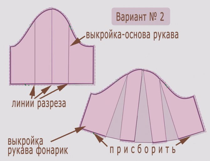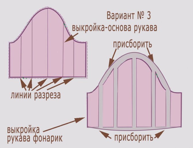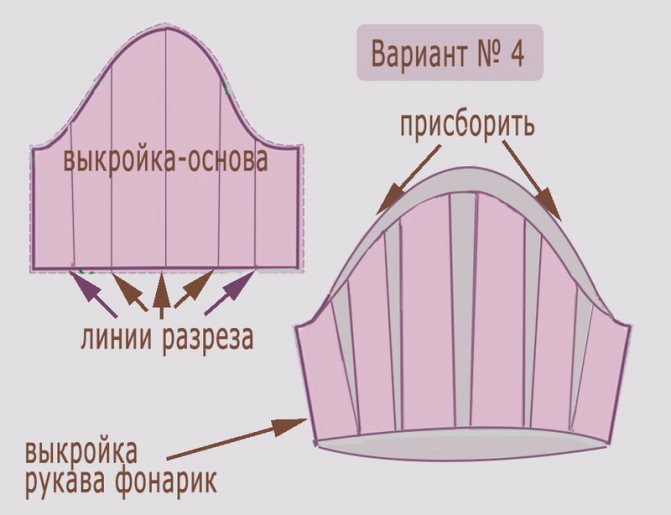 Подойдёт для тех, кто хочет сшить особенно пышный «фонарик»! Здесь всё будет немножко сложнее. Нам понадобится полностью разрезать выкройку-основу на шесть или более частей с формированием складочек в верхней и нижней части детали. Полученные составляющие рукава нужно равномерно раздвинуть на одинаковое расстояние.