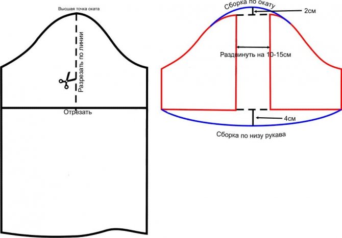 Приступаем к моделированию. На выкройке-основе откладываем от нижней точки оката желаемую длину готового рукава. Проводим горизонтальную черту и отрезаем лишнюю длину. Далее разрезаем рукавчик по вертикальной пунктирной линии до высшей точки оката так, как показано на чертеже слева. Раздвигаем два клина рукавчика на 10-15 см, затем поднимаем окат на 2 см и проводим по лекалу (или от руки) новый контур. По нижнему краю детали проводим кривую с максимальной глубиной 4 см, как показано на правом чертеже (синим цветом). Выкройка для рукава-фонарика готова! Излишки ткани, добавленные в ходе моделирования, мы в дальнейшем присборим или уберём в складки.