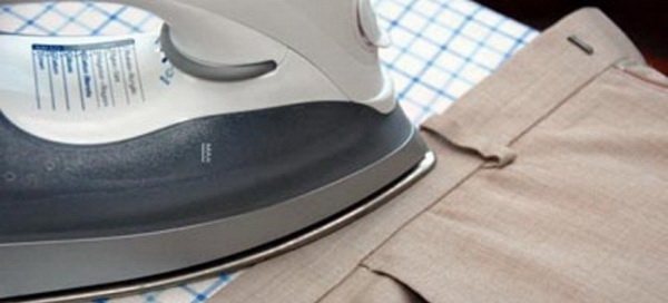 Направление разглаживания — сверху вниз. Брюки расправляют и надевают на гладильную доску с узкого края